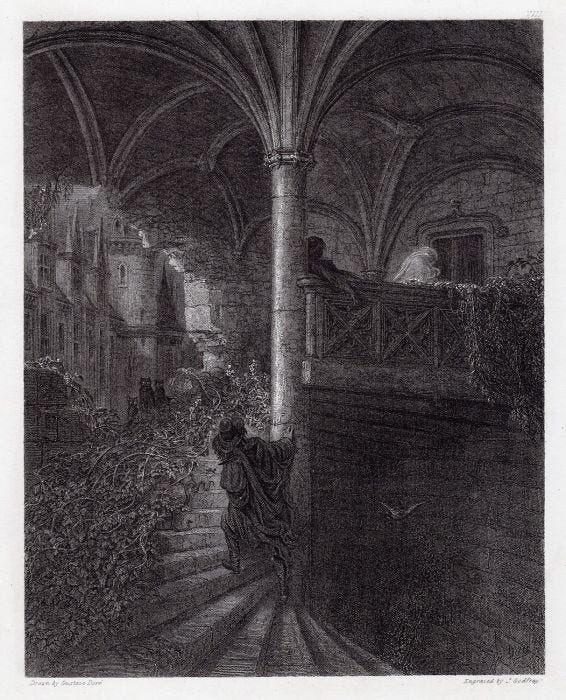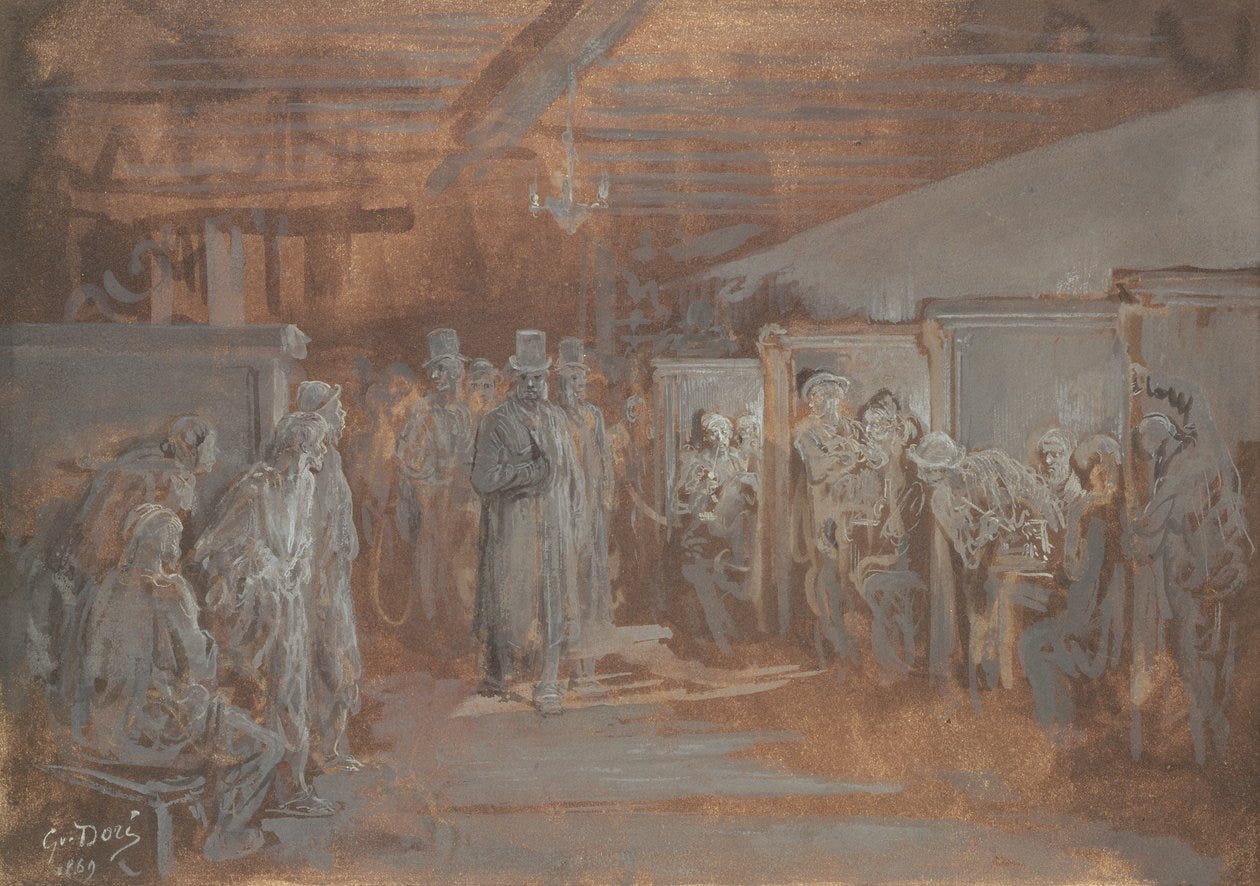 mantles pale against soot-dark stone,